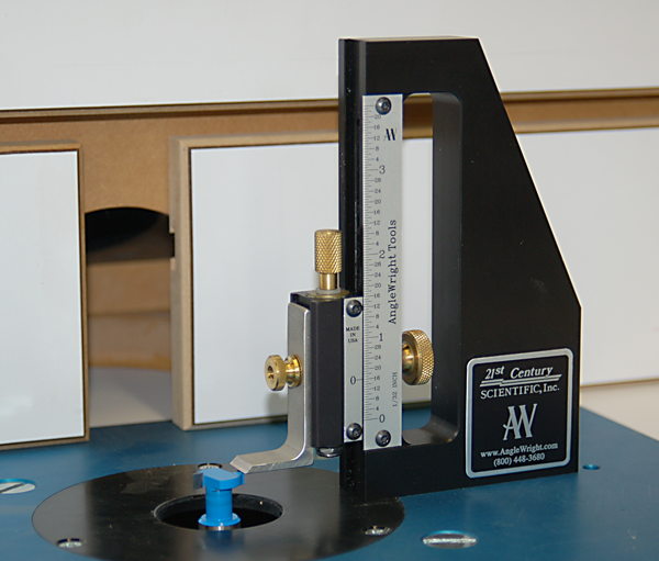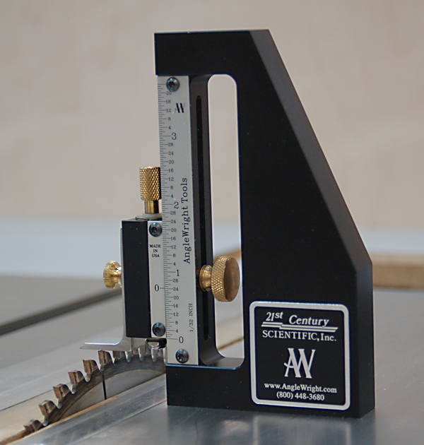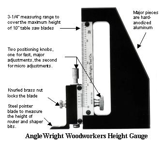 The AngleWright Woodworker's Height Gauge is a compact tool that enables precise height adjustments of shop tools such as routers, shapers, table saws and radial arm saws. The sliding piece that holds the steel pointer blade is dovetailed into the body of the tool. The dovetail ways are hand lapped to guarantee smooth operation. All knobs are recessed so the tool can be used laying flat on its side as well as in an upright position.